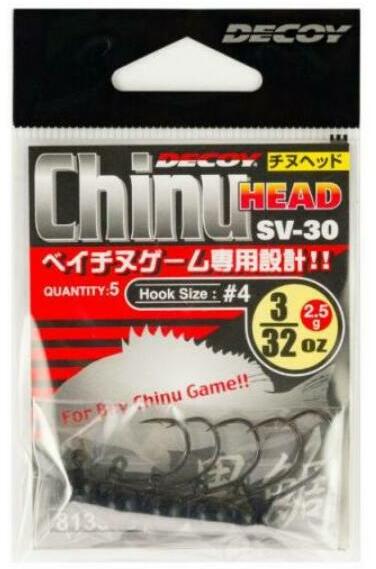 A Decoy SV-30 Chinu Head jigeket szénacélból készült japán horgokra öntik, amelyeket egy speciális kémiai technológiával éleznek, amely garantálja a nagy átütőerővel rendelkező éles hegyet. Minden egyes jig egyedileg tesztelt és kifejezetten puha csalikhoz tervezett, mivel nem befolyásolja az ilyen csalik természetes úszómozgását. A Decoy SV-30 Chinu Head jignél nagy figyelmet fordítottak a részletekre, és könnyen adaptálható bármilyen súlyhoz.