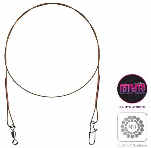 Delphin Acélhuzal BOMB! forgóval és kapoccsal 35cm/ 7 száll 75db. A BOMB! pergető acélhuzal a Delphintől, mely 7 rozsdamentes szálból van fonva (megjelölése 1x7). Jellemzője a nagyon sima felület, a nagy terhelhetőség és a jó ellenálló képesség a mechanikus sérülések ellen. A huzal lágy, így könnyű vele dolgozni, valamint jól dolgozik a vízben. Ezt a huzalt nem harapja át a legnagyobb ragadozó hal sem!A BOMB! huzal egyik végén forgó a másik végén kapocs van, melyek erős font csomóval csatlakoznak. A forgók és kapcsok nagysága a huzalhoz igazodik: