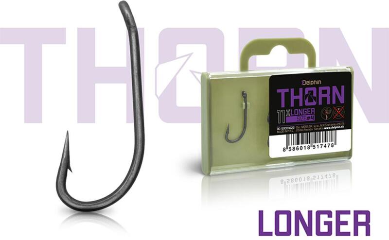 A Delphin THORN egy prémium minőségű pontyozó horog sorozat. Az ezen horgok gyártása során alkalmazott modern technológiák garantálják a kompromisszumok nélküli élességet és szilárdságot. A THORN sorozat horgainak TitanX bevonata matt szürke felülettel rendelkezik, amely elég sima ahhoz, hogy könnyedén átszúrja a pontyok száját. A TitanX bevonat garantálja a horog tartósságát és erejét. Az Ultrapoint 4.8 technológiával létrehozott hosszabb hegykiképzés rendkívüli élességet eredményez. Az extra védelem érdekében a Delphin THORN horgokat praktikus dobozban szállítjuk. Ráadásul az üzletekben használt akasztófülek könnyen letörhetők, szerszám nélkül is. Így kevesebb helyet foglalnak el a felszerelésben. A THORN Longer-nek hosszú, egyenes szára van, amely fülben végződik. A horog öble kicsi, hegye pedig hosszú és egyenes. Mindezen tulajdonságok miatt a horog nagyon gyorsan el tud fordulni és átszúrja a ponty száját. Ha olyan horgot keres, amely sok kapást eredményez és élvezetes horgászatot biztosít, a Longer a megfelelő választás az Ön számára. Ez a horogforma rendkívül sokoldalú; használható lebegő, kiegyensúlyozott vagy süllyedő csalikkal.