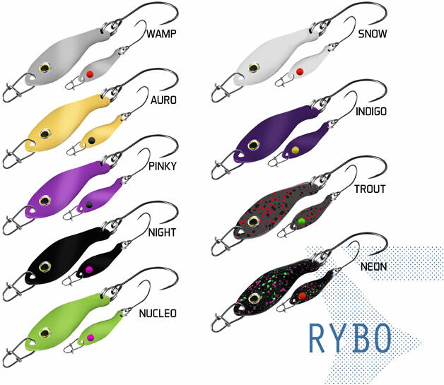 Villantó Delphin RYBO 8/0,5g. A Delphin RYBO villantó termékcsalád ideális műcsali a pisztrángos (Trout Area) horgászterületein. Testük cink ötvözetből készül. Minőségi BOMB! egyeshoroggal vannak felszerelve HardLure szakállal és FASTLOCK MICRO SNAP karabínerrel, hogy nehogy elveszítse fogását. A pisztrángon kívül nem vetik meg a tavakban vagy patakokban még kisebb ragadozó halak sem. Az a tény, hogy nagyon csábítóak a ragadozók számára, már az első pillantásra látható. A RYBO villantóknak kishal formájuk van nagy műszemmel, amely tökéletesen utánozza az élő csalit. Súly: 0,5g