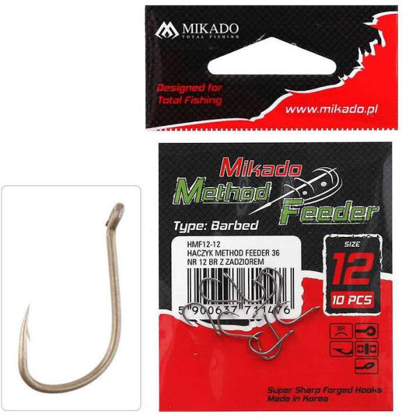 Mikado Method Feeder W/Barb 10 Arany Füles, Szakállas Pontyozó Horog 10db (HMF12-10)